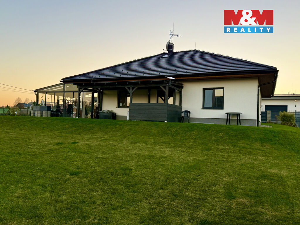 Hledáte svůj nový domov? Tak se přijeďte za námi podívat na tuto novostavbu ve stylu bungalov, s dispozicí 4kk a pozemkem 1 027 m2. Dům má bohaté úložné prostory, tři samostatné neprůchozí pokoje a útulný obývací prostor s kuchyňskou částí, která nabízí jídelnu, moderně vybavenou kuchyňskou linku a potravinový špajz. Odtud je také vstup do zimní zahrady, která je obyvatelná i v zimním období a její výměra činí 17 m2.Dům je napojen na veřejnou kanalizaci i vodovod. Vytápění je řešeno vodním podlahovým topením, prostřednictvím elektrického kotle. Také však lze využívat krb. Asi největší výhodou nejsou jen nízké náklady na provoz domu, ale také prostředí, kde dům nachází - klid , příroda a slunný pozemek, ale také přátelští sousedé, kteří se skládají z mladých rodin. Kromě domu, na pozemku najdete ještě technickou místnost, pro zahradní sekačku a jiné náčiní, také dvě parkovací zastřešená stání. S financováním Vám ráda pomůže naše hypoteční specialistka s dlouholetou praxí.