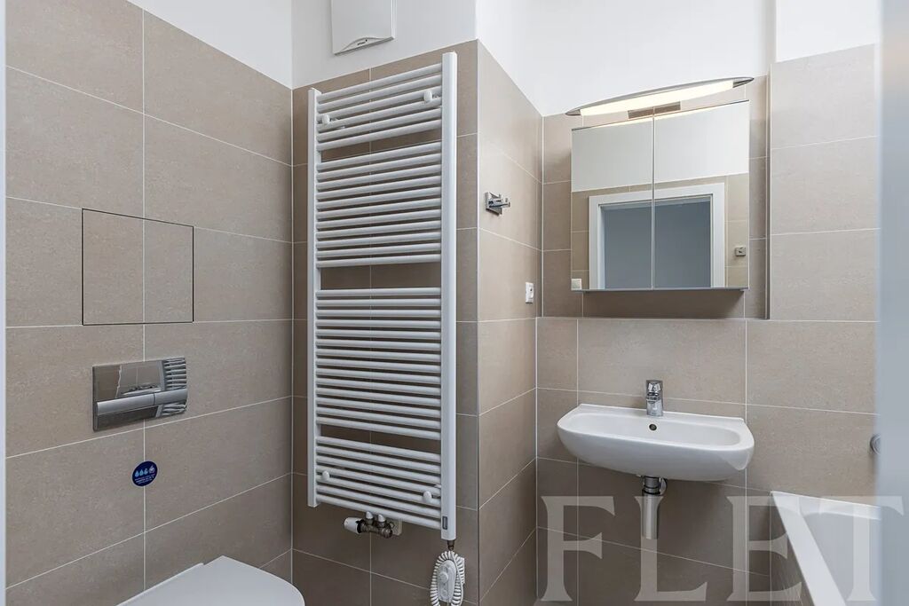 Interiér bytu působí vzdušně a promyšleně. Hlavní obytná místnost nabízí propojení kuchyňského koutu s moderní linkou a spotřebiči, jídelní části a prostoru pro odpočinek. Byt je vkusně a kompletně zařízen – nechybí postel, vestavěné skříně ani jídelní stůl, takže je připraven k okamžitému nastěhování. Koupelna je elegantní, vybavená vanou, umyvadlem a toaletou. Pračka je prakticky umístěna ve skříni v chodbě. Z obývací části je vstup na balkon s příjemným výhledem do okolní nové zástavby.