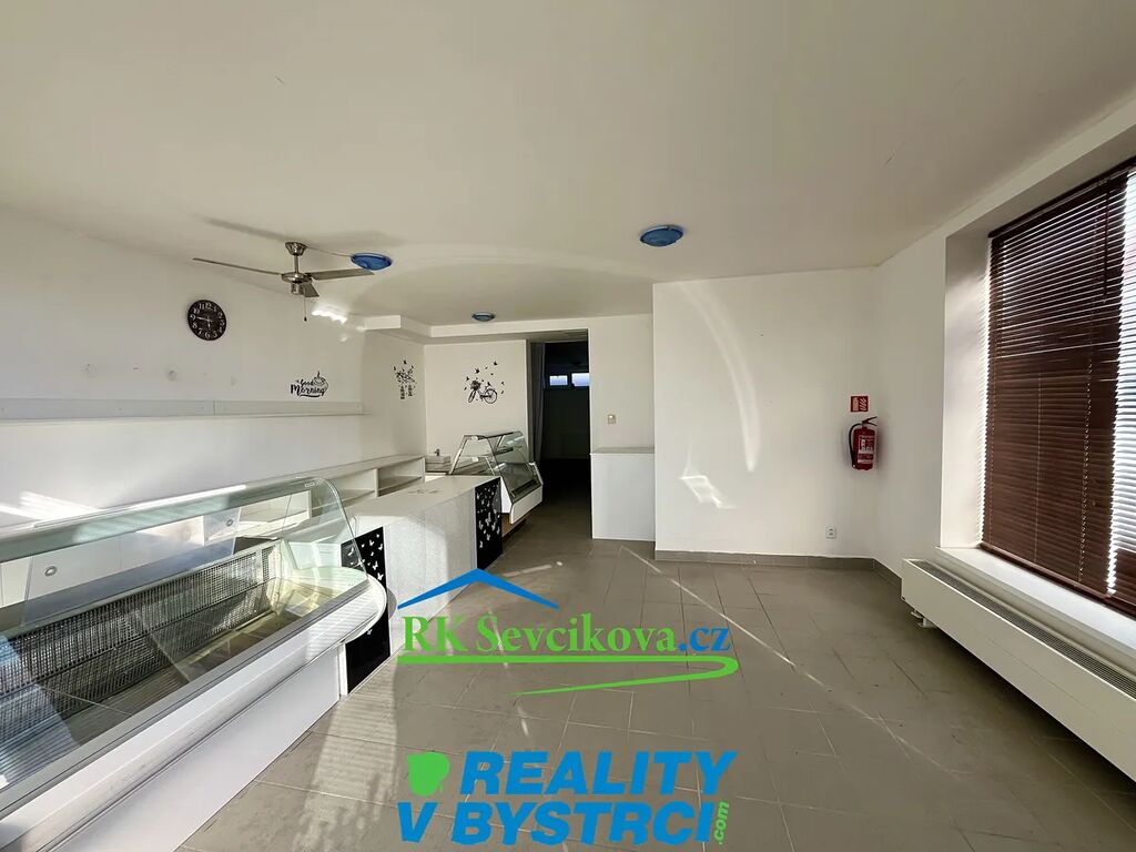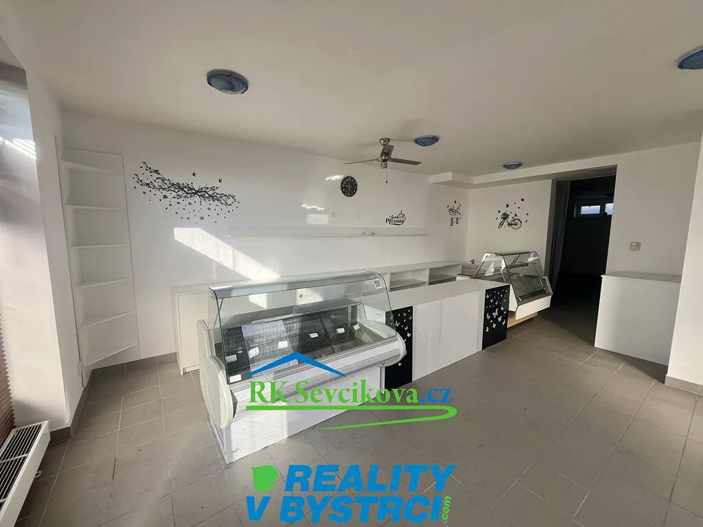 Prostor se nachází v krajní části domu a disponuje dvěma velkými výlohami směřujícími přímo do ulice, což zajišťuje výbornou viditelnost. V blízkosti se nachází zastávka autobusu a oblast je dobře dopravně dostupná. Prostor je tvořen dvěma místnostmi, které jsou částečně oddělené příčkou. Přední místnost se vchodem z ulice a výlohami, zadní místnost s okny v horní části stěny. Součástí je také předsíň před toaletou a samostatné WC s umyvadlem.
