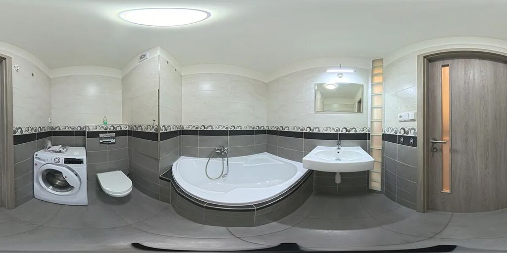 Koupelna prošla kompletní rekonstrukcí a je zařízena vanou, umyvadlem, toaletou a pračkou.