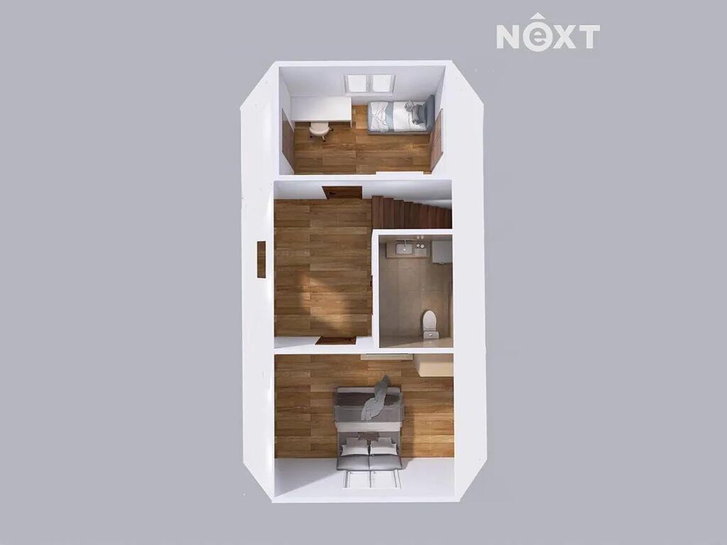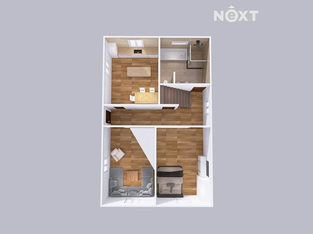 Co dál? Kuchyň s ostrůvkem velká tak akorát, z které můžete vyjít přímo na terasu. Velká stylová koupelna s vanou, sprchovým koutem a toaletou. Druhé wc najdete o patro výše. Nejen pro větší rodinu ideální dispozice.
