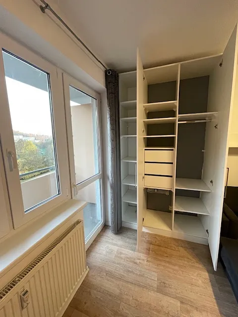 V bytě se nachází vstupní předsíň, koupelna s toaletou a obývací pokoj s kuchyní. V kuchyni je moderní kuchyňská linka s dotykovými kamny na vaření a pečící elektrickou troubou, digestoř, lednice. V obývací části se nachází moderní lamelový obklad na stěně naproti pohovce, který působí velmi vřelým a útulným dojmem. Na konci pokoje jsou dvě vestavěné, šatní a šuplíkové skříně. Ve zděné koupelně stojí automatická pračka, koupací vana, umyvadlo se zrcadlem, infrazářič. Naproti koupelně se nachází toaleta, ukládací skříňka a zrcadlo. Okna a lodžie jsou v plastu, opatřena zatemňovacími závěsy. Na podlahách je v předsíni a v koupelně dlažba, v obývací místnosti položen vinyl. K bytu náleží prostorná lodžie, která je situována na východní stranu domu.