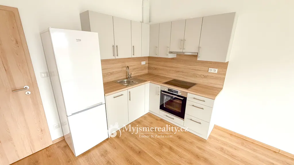 Je zde nová kuchyňská linka se sklokeramickou varnou deskou, troubou a lednicí.