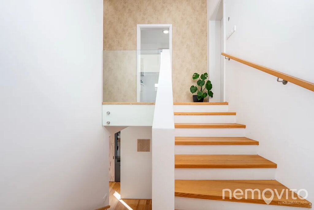 Hlavní obytný prostor s velkými okny do zahrady má rovných 40 m2 a pojí v sobě velkou kuchyni, obývák a prostor na plnohodnotnou jídelnu. Pod příjemnou dřevěnou podlahou je podlahové topení, přičemž roční spotřeba se pohybuje do úrovně 14 MWh plynu. Skvělým bonusem je samostatná prádelna/technická místnost, která má vstup z obýváku i ze zahrady a její velikost je 7 m2. Prádelnu pak doplňují ještě dvě komory - jedna nahoře a jedna dole.