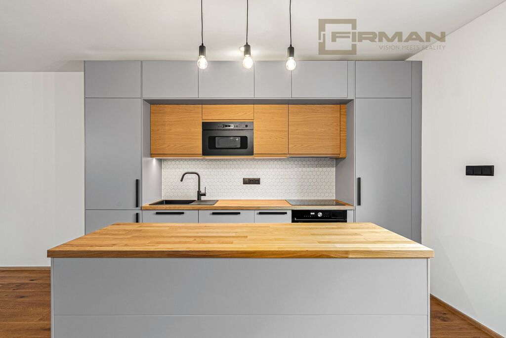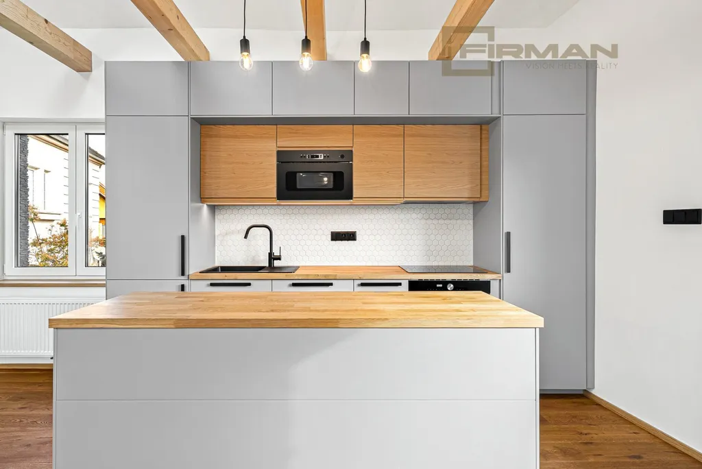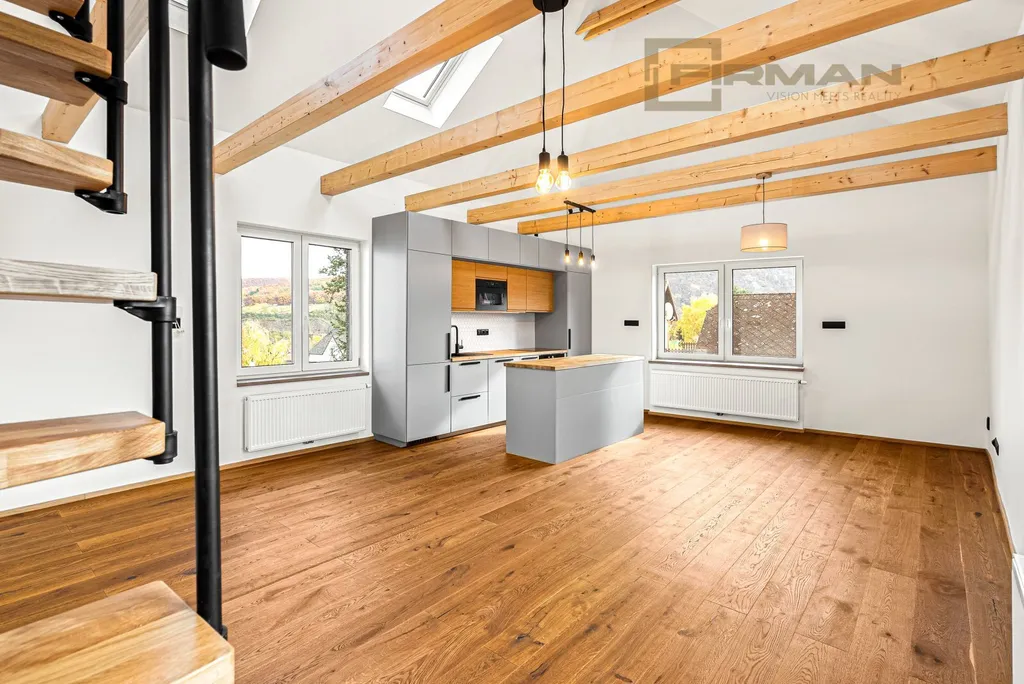 Horní byt s dispozicí 3kk s balkonem a podkrovní místností 27 m², kde je snížená výška stropu, proto ji neuvádím jako samostatný pokoj, vás okouzlí velkorysým obývacím prostorem s novou kuchyní, vybavenou moderními spotřebiči, přiznanými dřevěnými trámy a vysokými stropy, které mu dodávají jedinečný charakter. O přítmí během slunečních dnů se postarají dálkově ovládané střešní žaluzie a z oken můžete vnímat energii největšího známého keltského oppidia v Čechách i ve Střední Evropě – Závist, které se rozprostírá na protilehlém břehu Vltavy.