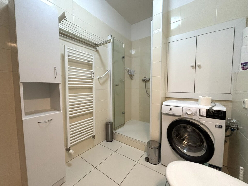 V koupelně je sprchový kout, koupelnová skříňka, umyvadlová skříňka s umyvadlem a osvětleným zrcadlem a pračka. Součástí koupelny je také topný žebřík.