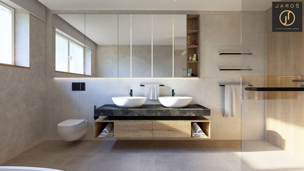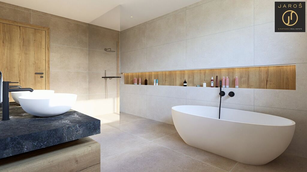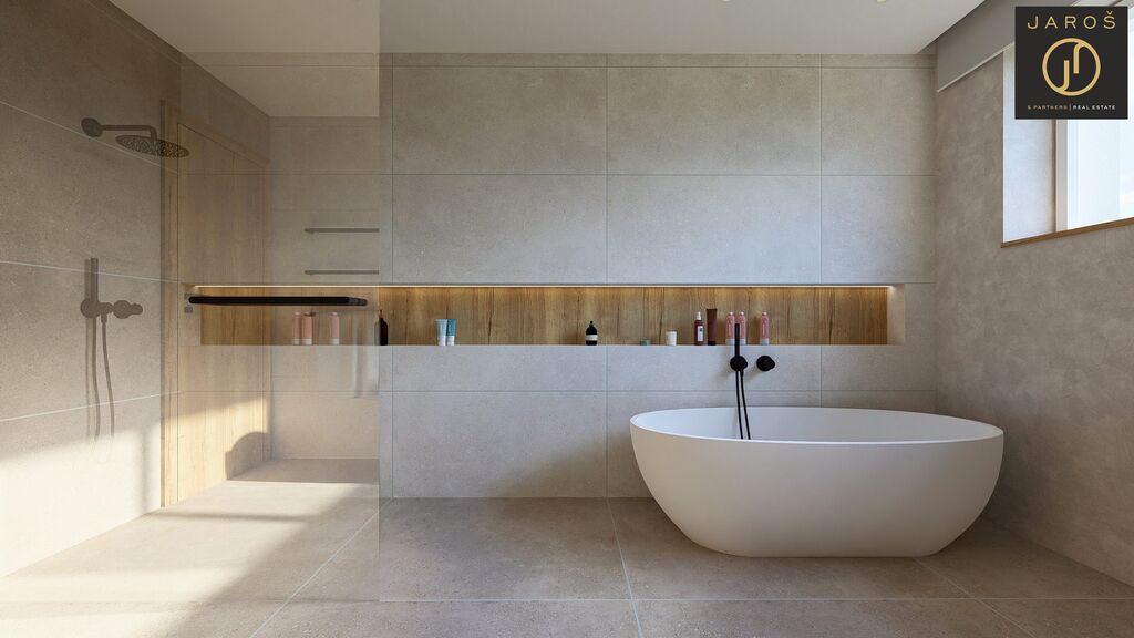 Nemovitost je vystavěna z velice kvalitních materiálů s vysokým standardem vybavení – velkoformátové obklady a dlažby, kvalitní a energeticky úsporné materiály, rekuperace. Vytápění bude zajištěno podlahovým topením skrze tepelné čerpadlo zn. NIBE. Dům bude mít přípravu na fotovoltaiku, bude celkově zateplen (Polystyren 250mm), ohřev vody zajištěn rovněž tepelným čerpadlem. Energetická náročnost: B - Velmi úsporná