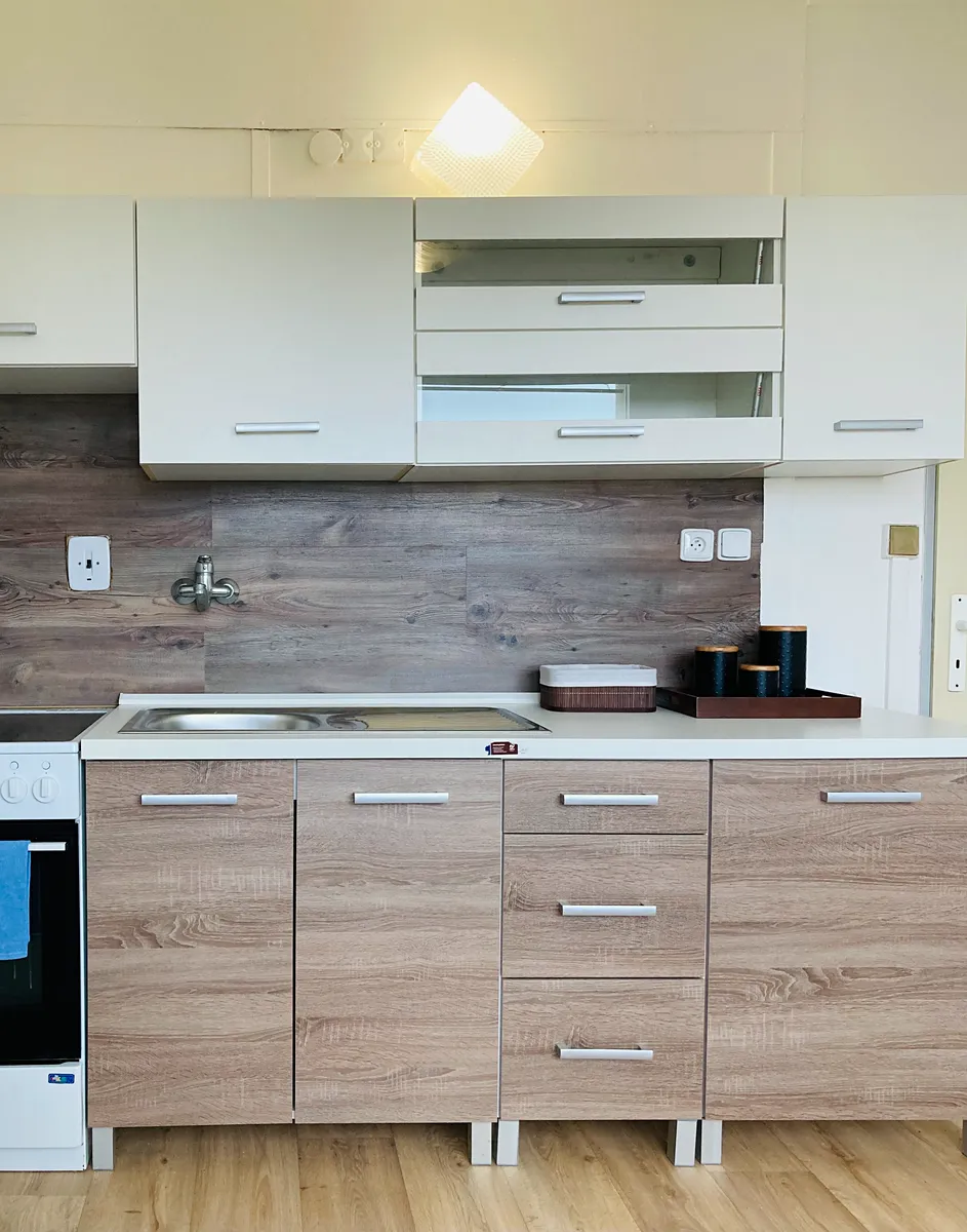 Dispozice bytu: vstupní chodba s vestavěnou skříní, koupelna se sprchovým koutem, umyvadlem a toaletou, pokoj, kuchyň vybavená kuchyňskou linkou, kombinovaným sporákem, ledničkou.