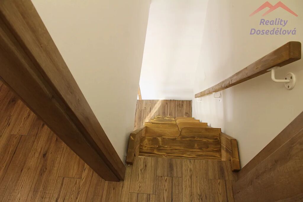 V přízemí se nachází kuchyňka s jídelním koutem, obývací pokoj, koupelna se sprchovým koutem a toaleta, dřevěné schodiště do patra (mlynářské schody).
