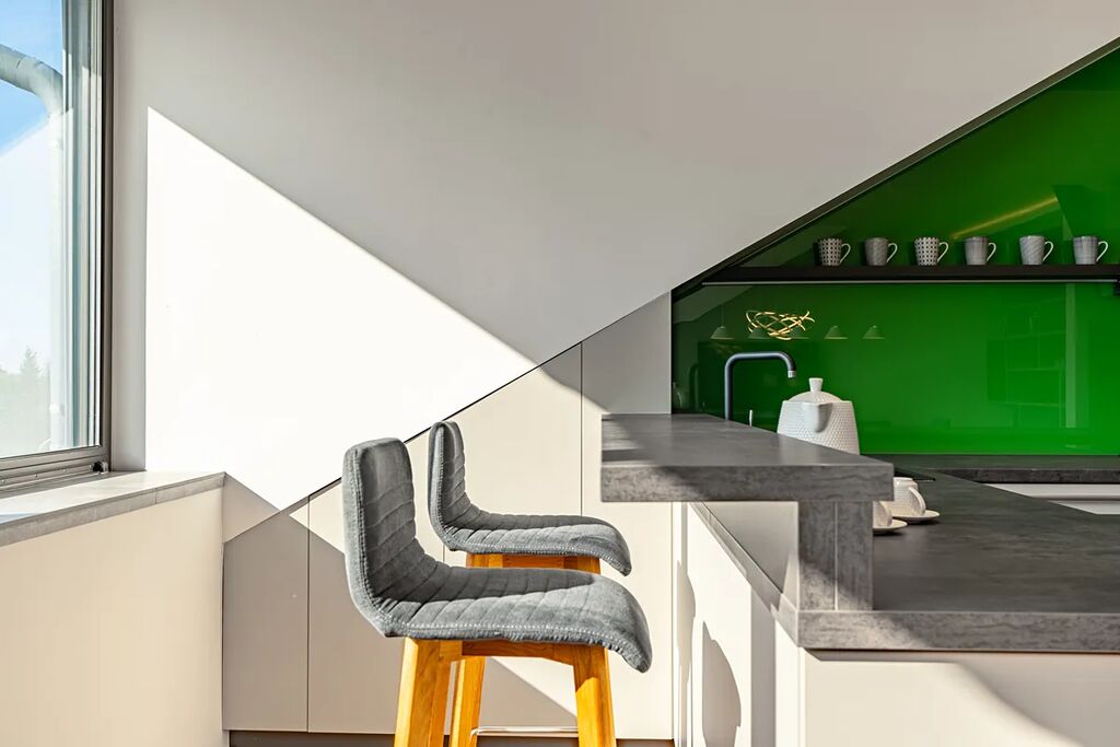 Obývací část díky vysokým stropům a velkým oknům působí otevřeně a svěže, přitom si zachovává soukromí i příjemnou atmosféru domova.