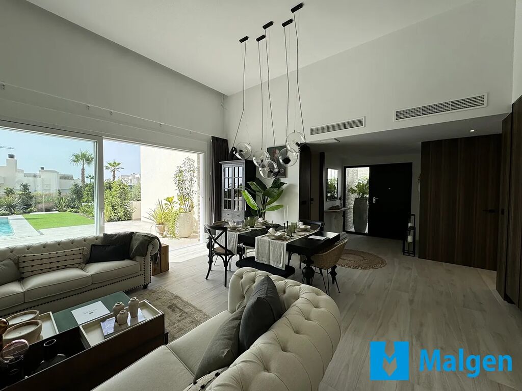 Z obývacího pokoje je přímý vstup do zahrady, kde si můžete užívat středomořské klima na velké terase s pergolou a soukromým bazénem.