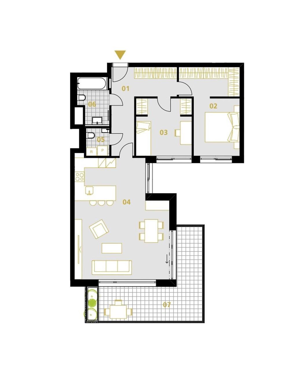 Dispozičně se jedná o velké 3+kk. Prostorově dominuje obývací pokoj s kuchyní na míru s 40 m. Ložnice s vestavěnými skříněmi má 12 m² a další místnost lze využít jako pracovnu nebo dětský pokoj. Samozřejmostí je koupelna s wc a k dispozici je také samostatné wc s komorou. Ve vstupní hale jsou již připraveny vestavěné skříně a velkou radost Vám udělá terasa (20,6 m²). Součástí nájmu je také sklep (10 m²), vlastní parkovací stání v garáži a jedno stání před domem. Za poplatek je možné využít zásuvku pro nabíjení vozidel. I např. pro návštěvu nebude problém zaparkovat na okolních parkovacích zónách.