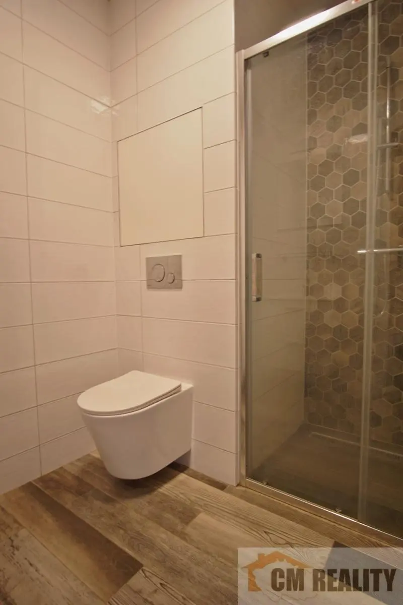 Z obývacího pokoje je vstup do menší ložnice. Interiér bytu dotvářejí plovoucí podlahy a designová světla. V domě jsou plastová okna a centrální vytápění s ohřevem vody.