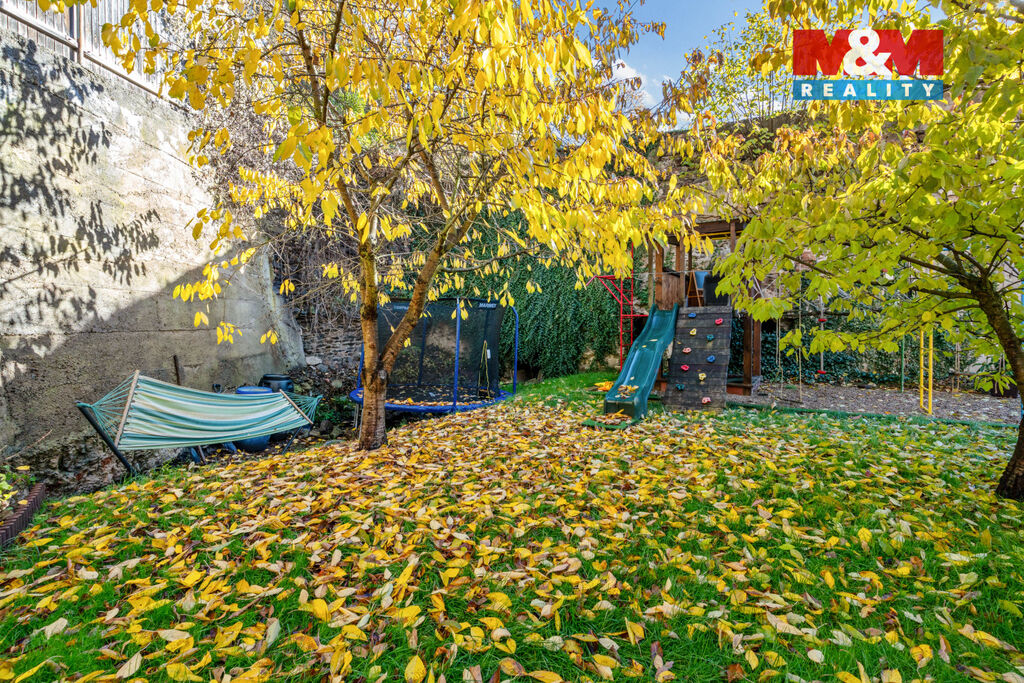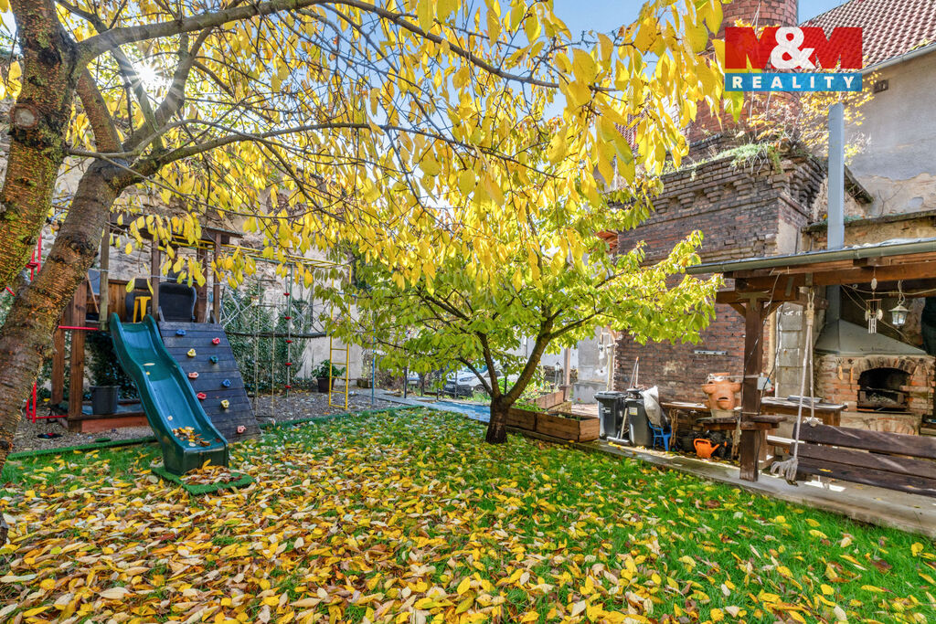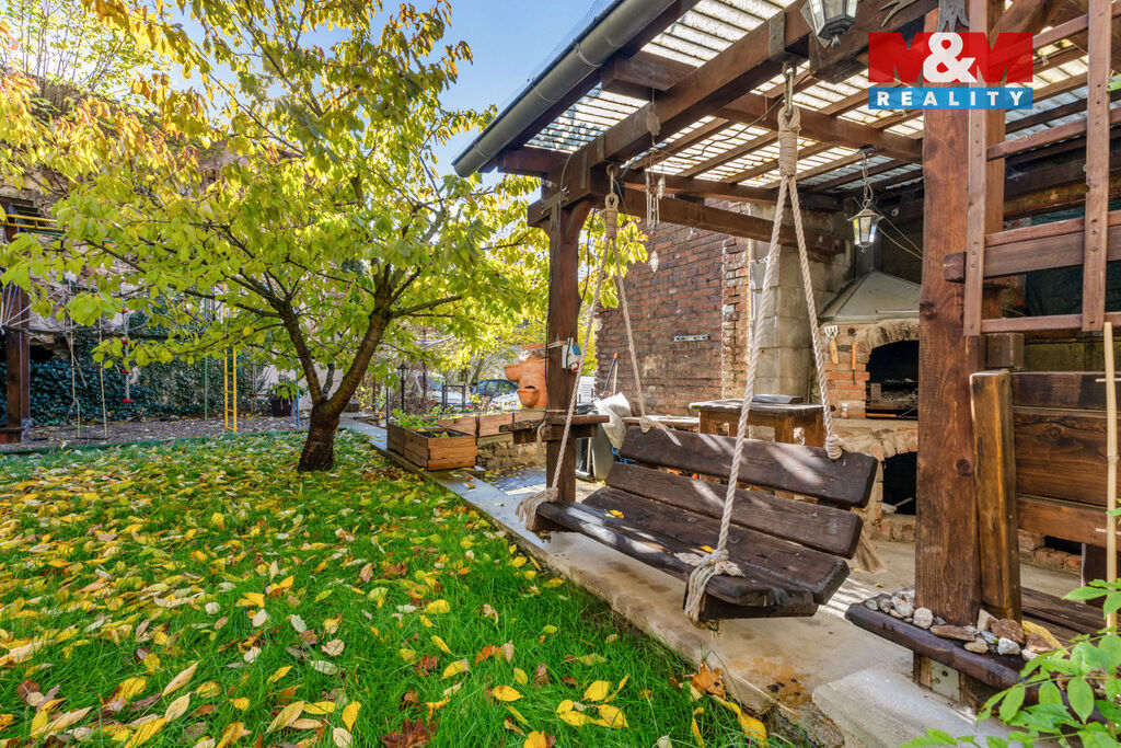 Na zahradě najdeme prolézačky pro děti a krásnou pergolu s grilem. Ale nebojte, místo na bazén se také najde.