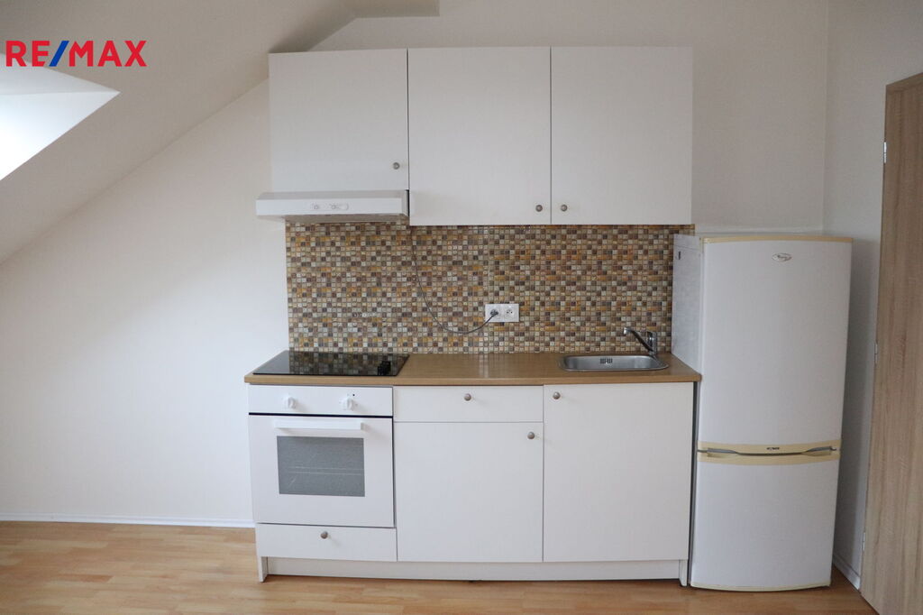 Kuchyňský kout je vybaven varnou deskou, troubou a lednicí.