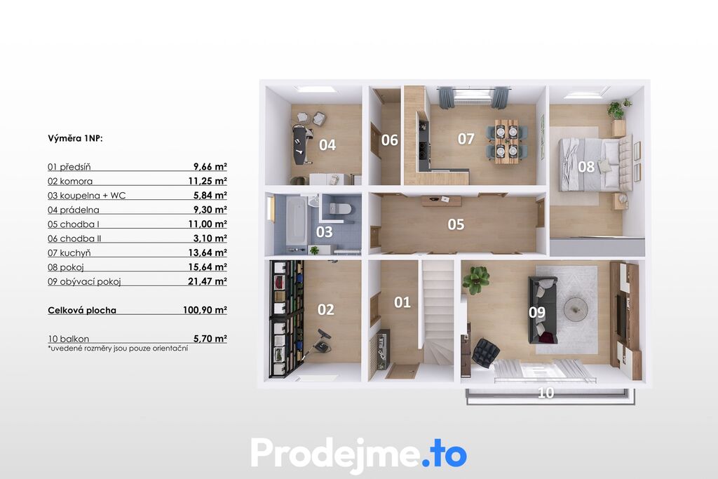 V patře se nachází druhá jednotka 4+1 o výměře 96 m2 – kuchyň, obývací pokoj, ložnice, dva pokoje, koupelna, samostatné WC a dva prostorné balkony s výhledem do okolí.