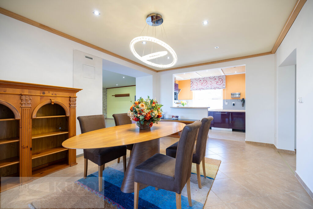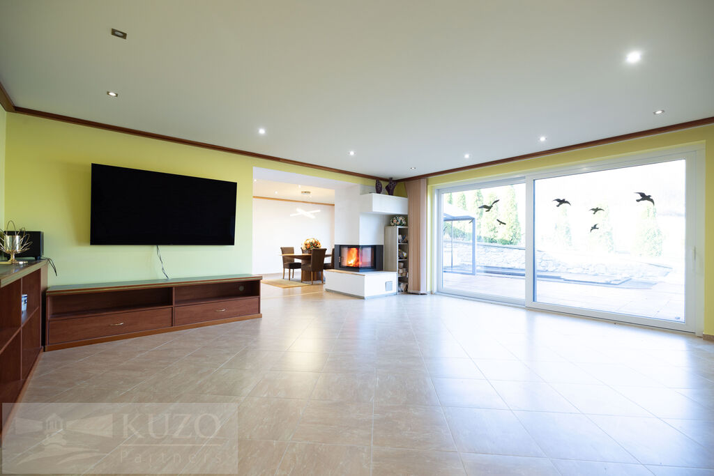 V přízemí (126,17m2) se nachází vstupní chodba s šatní skříní a botníkem, prostorný obývací pokoj s krbem, jídelna s kuchyňským koutem s vestavěnými el.spotřebiči, samostatné WC, prostorná šatna s úložným prostorem pod schodištěm, ložnice s šatnou, koupelna se sprchovým koutem, WC, 2xumyvadlo, sauna, technická místnost.