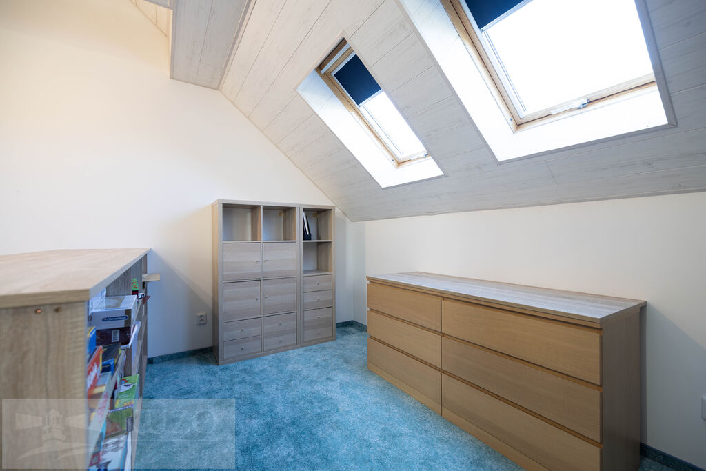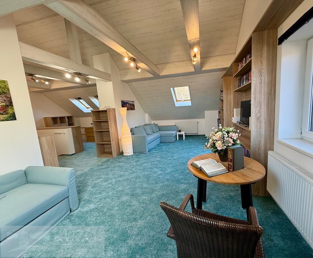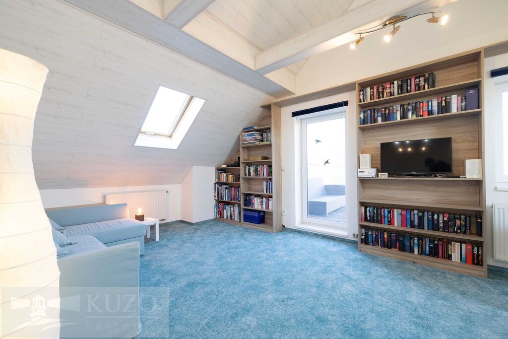 V podkroví ze tří ložnic vznikl jeden členitý otevřený pobytový prostor (57,42m2) se vstupem na terasu 18,04m2, koupelna a WC, lze uvést do původního stavu.