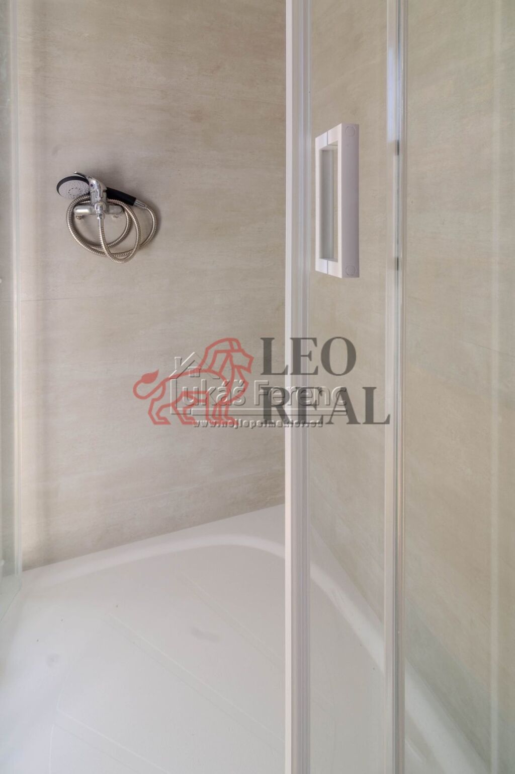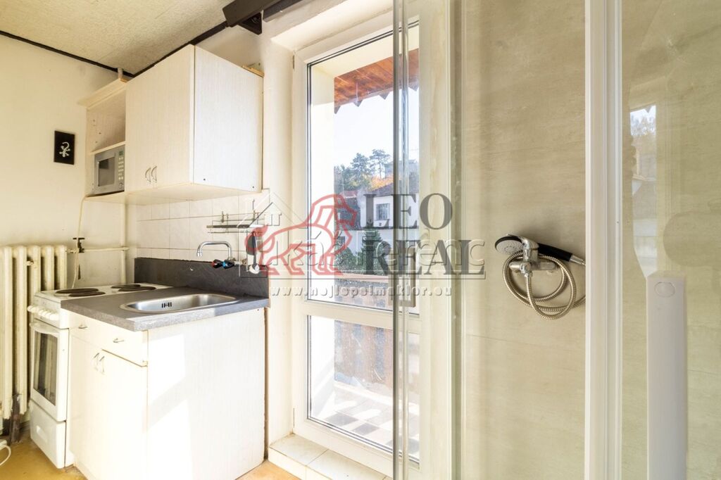 Za vstupními dveřmi do bytu se nachází kuchyně, ve které je umístěn nový sprchový kout. Kuchyň je vybavena starší kuchyňskou linkou s kombinovanou elektrickou troubou a elektrickými varnými plotýnkami. K dispozici je také rychlovarná konvice a mikrovlnná trouba.