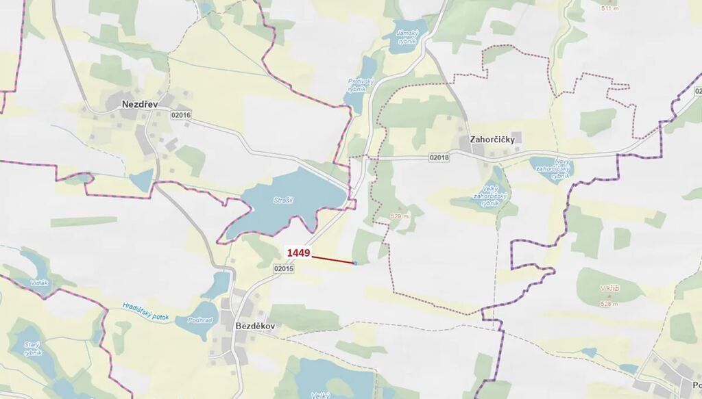 Lesní pozemek o výměře 638 m2, parcelní číslo 1449, podíl 1/1, katastrální území Bezděkov u Kasejovic, obec Hradiště, obec s rozšířenou působností Nepomuk, okres Plzeň-jih, Plzeňský kraj. Po těžbě.