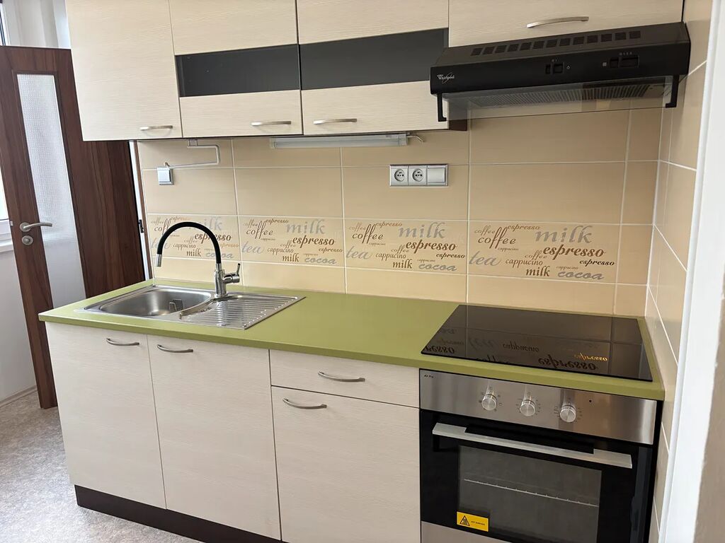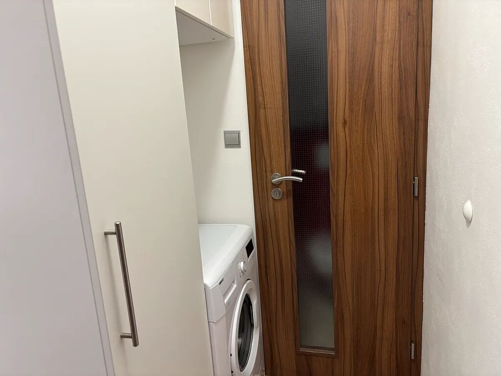 Byt je kompletně zařízen, pračka zn. Beko, lednice, mikrovlnná trouba, obývací stěna, postel, Tv, sedací souprava, stolek, jídelní stůl a židle, komoda a led osvětlení v celém bytě.