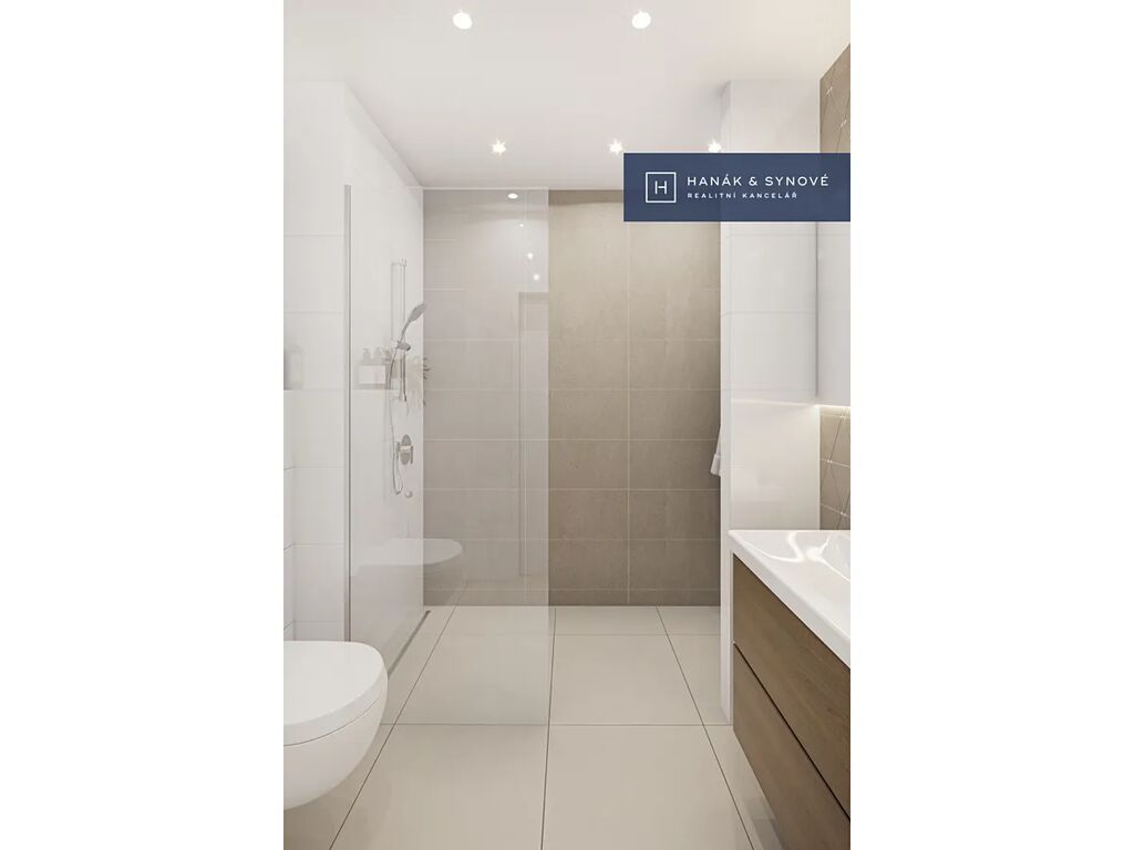•Koupelna s velkorysým walk-in sprchový koutem se skleněnou stěnou Hüppe a podlahovým nerezovým žlabem je dále vybavena umyvadlovou a podsvíceným zrcadlem, sanitární keramikou značky Villeroy&Boch, chromovou umyvadlovou i sprchovou baterii Hansgrohe. Celkovou atmosféru dotváří rafinované nasvícení pomocí zapuštěných podhledových světel a led pásků.