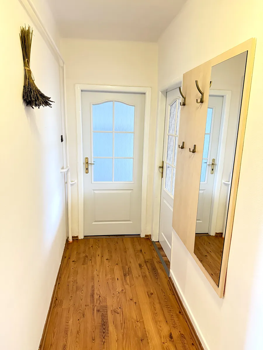 Dispozici bytu tvoří hlavní obytný prostor, ložnice a dětský pokoj/pracovna, dále vybavená kuchyně s kuchyňskou linkou a dostatkem úložných prostor, lednicí s mrazákem, vestavnou troubou, plynovým sporákem, myčkou, dřezem, digestoří a mikrovlnnou troubou. Koupelna je osazena vanou, umyvadlem se skříňkou a zrcadlem; toaleta je samostatná průchozí přes koupelnu a má okno. Ve vstupní hale je zrcadlo a věšáková stěna. K bytu náleží dva velmi praktické sklepy s okny (jeden zděný s regály a jedna dřevěná sklepní kóje), v domě je společná kolárna a za domem zahrada s pískovištěm a místem k odpočinku.