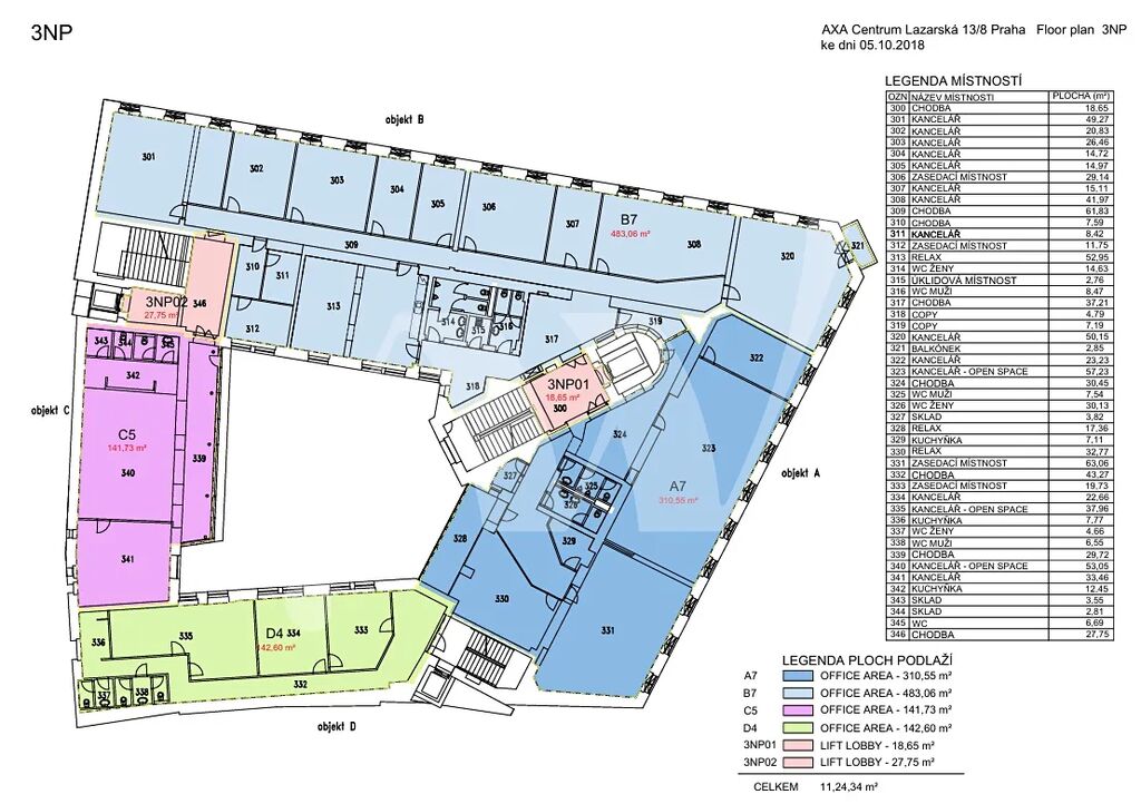 Nabízíme k pronájmu kancelář o velikosti 142 m2 ve 4. patře (jednotka D4, budova D, označena zeleně):