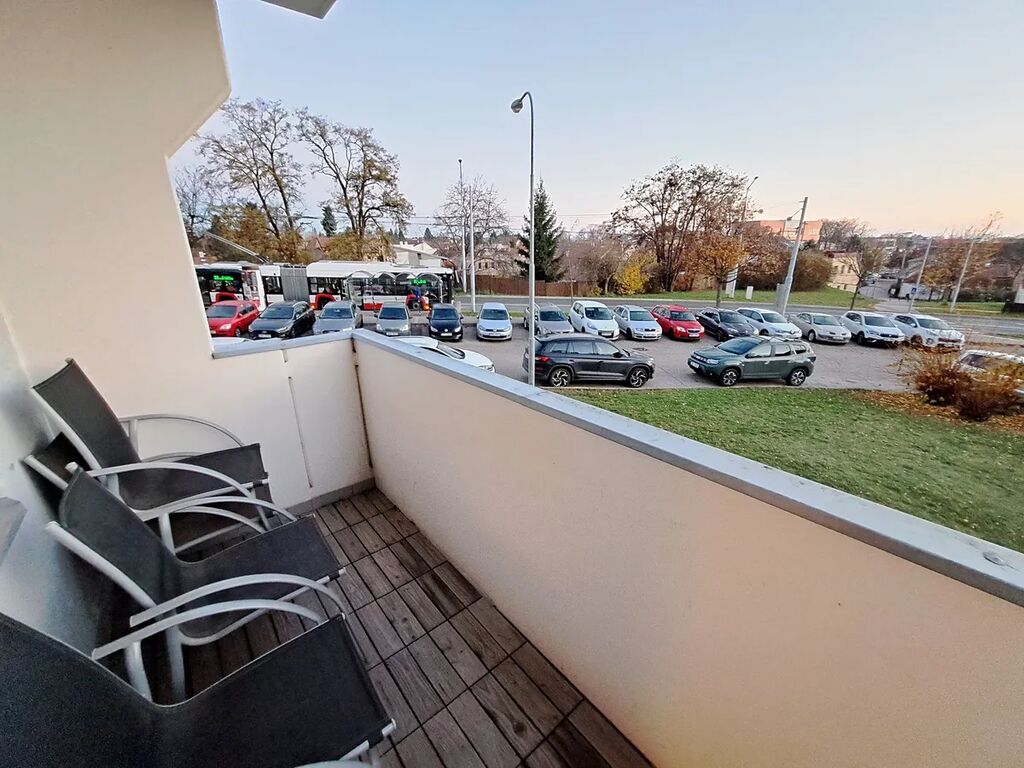Balkón (4x židle). K bytu náleží standardně jedna sklepní kóje + další o velikosti 20 m² s bezpečnostním uzamykáním.