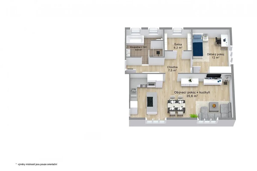 Součástí kuchyně je navazující obývací pokoj a celkový prostor tak dosahuje 36m2.