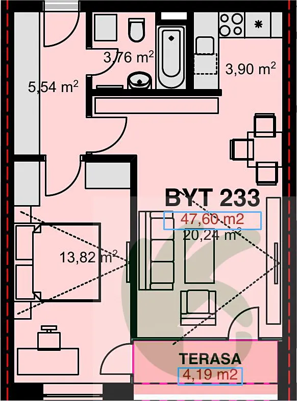 Byt se nachází v novostavbě a je tvořen: prostornou chodbou, odkud je vstup do koupelny s toaletou, kde je k dispozici vana, umyvadlo a toaleta. Další dveře Vás zavedou do prostorného obývacího pokoje s kuchyňským koutem, ze kterého můžete vstoupit do ložnice a na terasu.