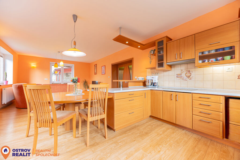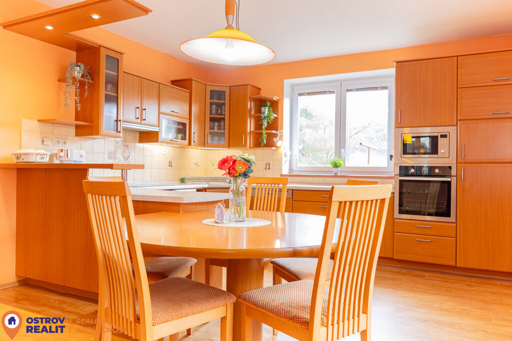 Otevřený prostor působí vzdušně a útulně zároveň, nabízí dostatek místa pro rodinné posezení i setkávání s přáteli. Kuchyně je prakticky řešená s možností přímého kontaktu s obývací částí, takže při vaření neztratíte přehled o dění v domě. Z obývacího pokoje je navíc možnost vstupu na zahradu, kde najdete útulnou terasu s posezením.