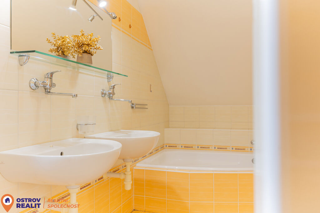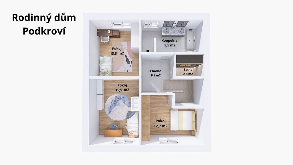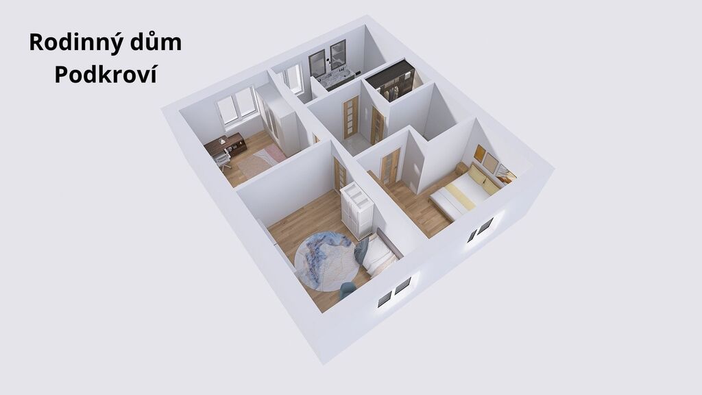 Součástí patra je také komfortní koupelna s WC, vybavená vanou i dostatkem prostoru pro úložné řešení. Celé patro působí světlým a klidným dojmem – ideální zóna pro odpočinek a rodinné zázemí.