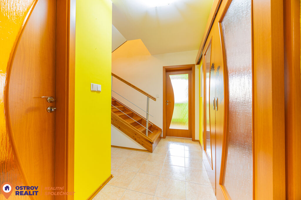Po vstupu do domu vás přivítá praktické zádveří s prostorem pro botník. Následuje prostorná chodba se schodištěm, z které se dále dostanete do všech koutů domu. V přízemí se nachází také koupelna s WC a pracovna, ideální jako domácí kancelář, pokoj pro hosty nebo klidné místo na studium.