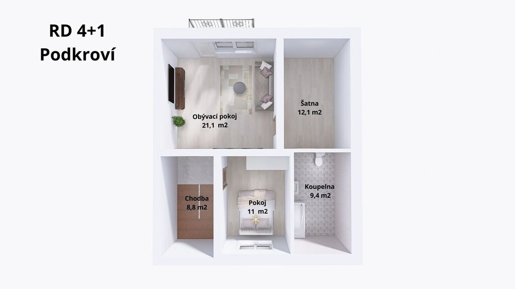 V přízemí domu vás přivítá prostorný obývací pokoj se vstupem na terasu, odkud vedou schody přímo na zahradu. Tato dispozice nabízí skvělou možnost, jak prostor rozšířit – například o velkou terasu navazující na obývací část, ideální pro letní posezení či grilování s rodinou. Dále se v přízemí nachází samostatný pokoj, kuchyně s jídelním koutem, koupelna s WC a praktická spíž.