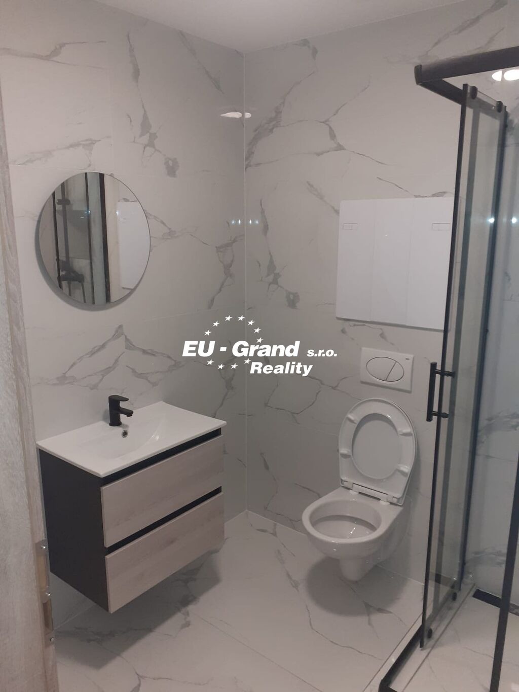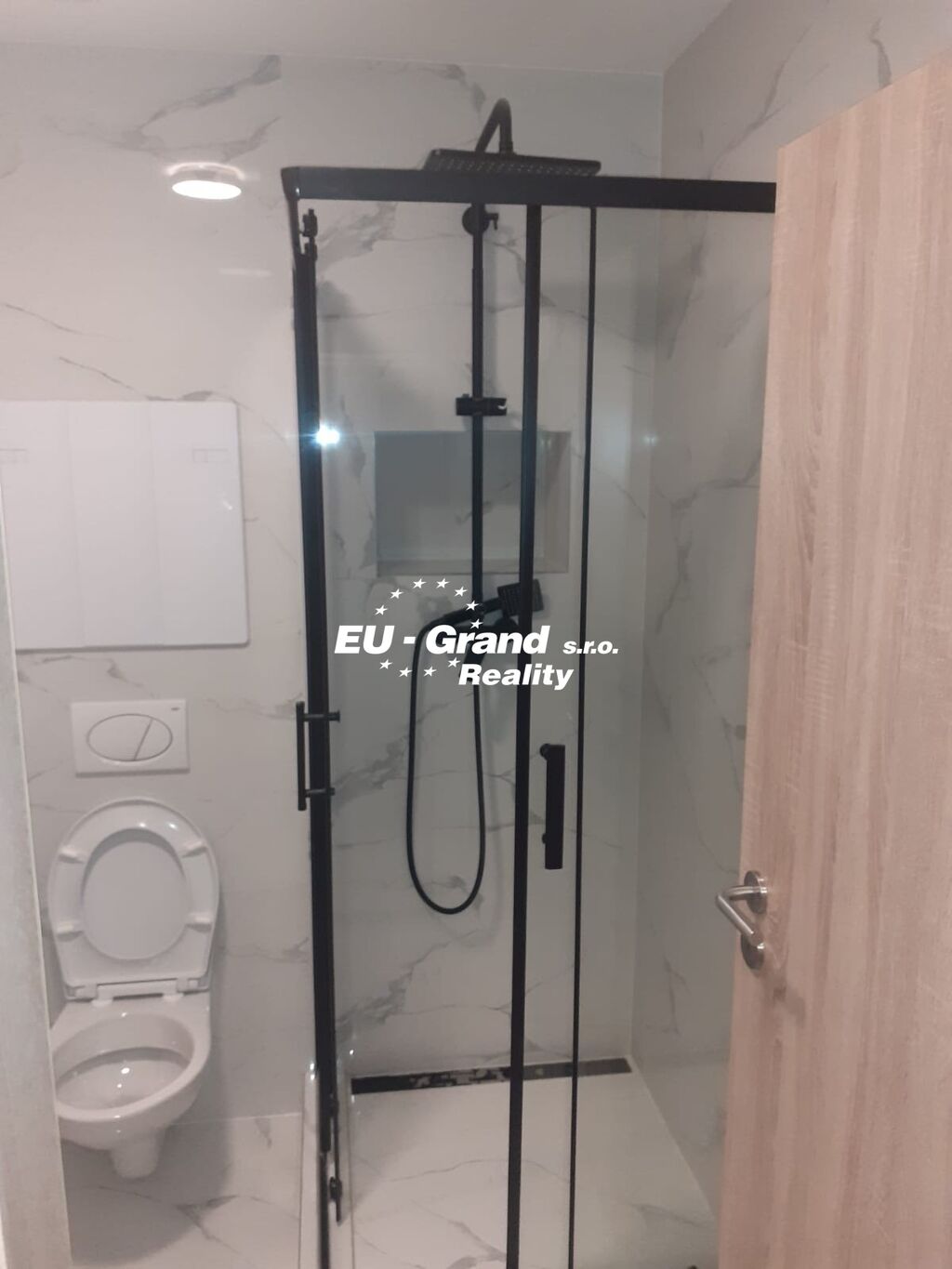 Koupelna je společná s WC. Je vybavená umyvadlem, sprchovým koutem a dostatečným prostorem pro umístění pračky.