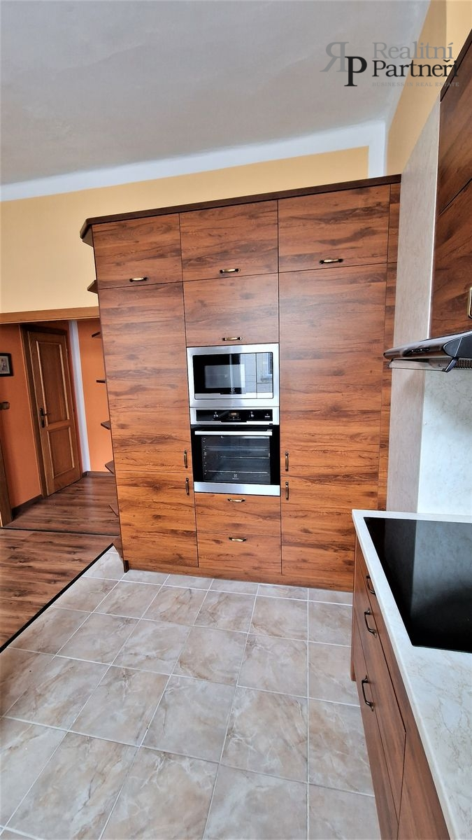 V prvním patře je vstupní chodba, samostatné WC, prostorná kuchyň, obytný pokoj, prostorný obývací pokoj, koupelna s vanou, sprchovým koutem a saunou.