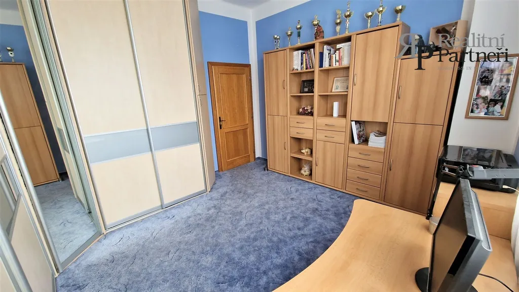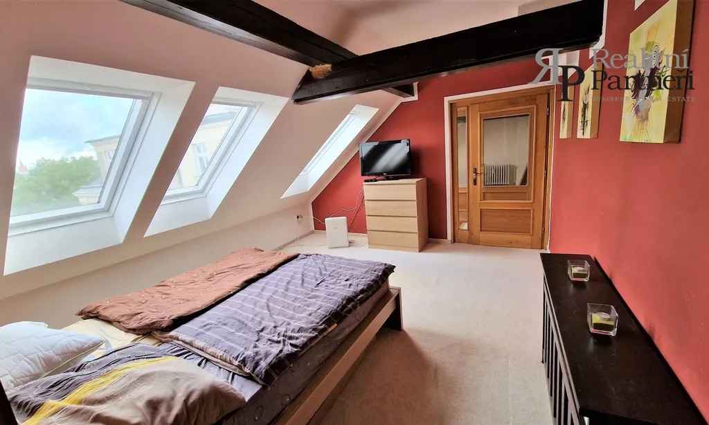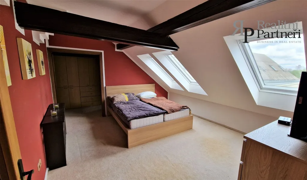 Z obývacího pokoje vedou dubové schody do druhého patra bytu, kde se nachází dva obytné pokoje. Jeden z těchto pokojů má k dispozici šatnu.