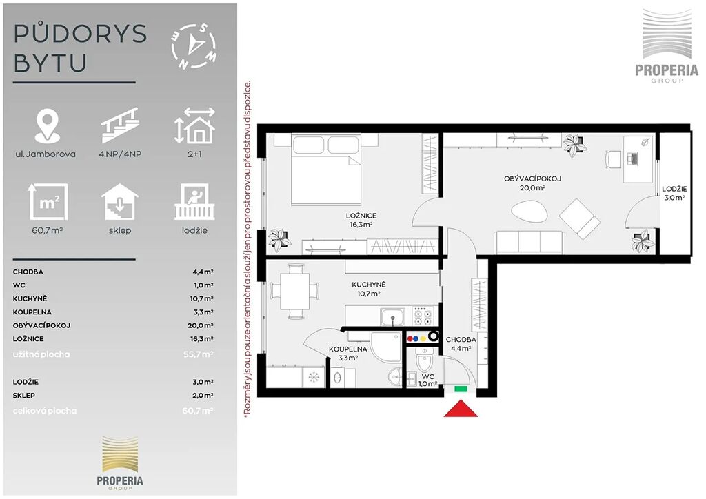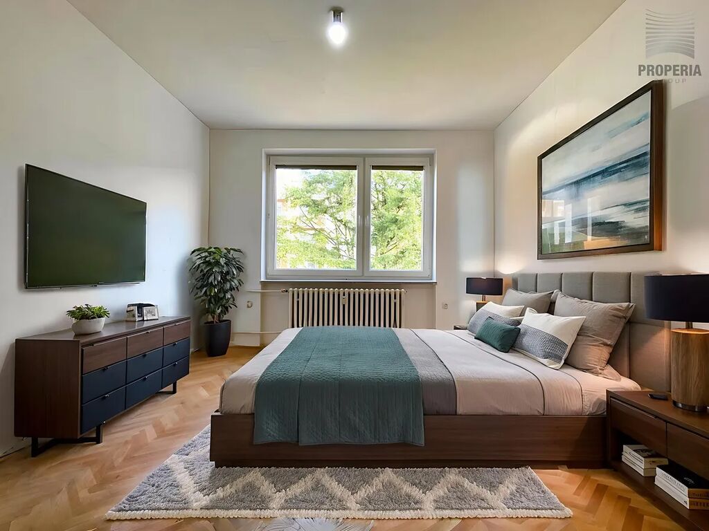 Ložnice a kuchyně jsou orientovány na severovýchod do klidného, zelení obklopeného vnitrobloku. Kuchyně je vybavena kuchyňskou linkou, plynovým sporákem, digestoří, elektrickou troubou a lednicí s mrazákem. Obývací pokoj s lodžií o ploše 3 m² směřuje na jihozápad, díky čemuž je byt krásně prosvětlený a nabízí příjemný výhled do okolí.