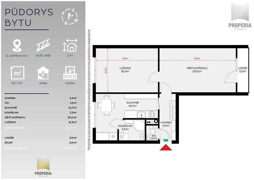 Byt o užitné ploše 55,7 m² se nachází ve 4. nadzemním podlaží panelového domu, který disponuje jedním suterénním a čtyřmi obytnými patry.