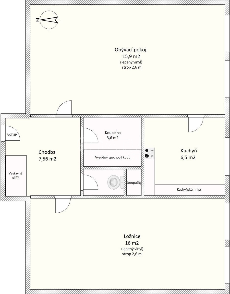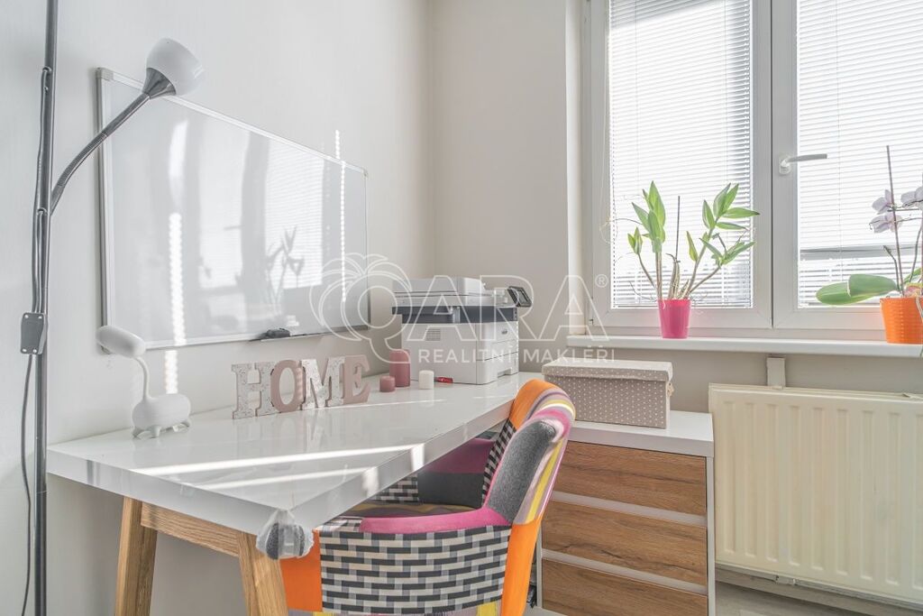 Byt prošel kompletní rekonstrukcí před sedmi lety. Po vstupu do bytu se nachází prostorná chodba s vestavěnou skříní na míru, která prakticky řeší potřebu úložného prostoru. Naproti vstupním dveřím je koupelna se sprchovým koutem, vedle ní samostatné WC. Vpravo od vstupu se nachází ložnice, vlevo obývací pokoj s pracovním koutem, ze kterého se vstupuje do plně vybavené kuchyně.