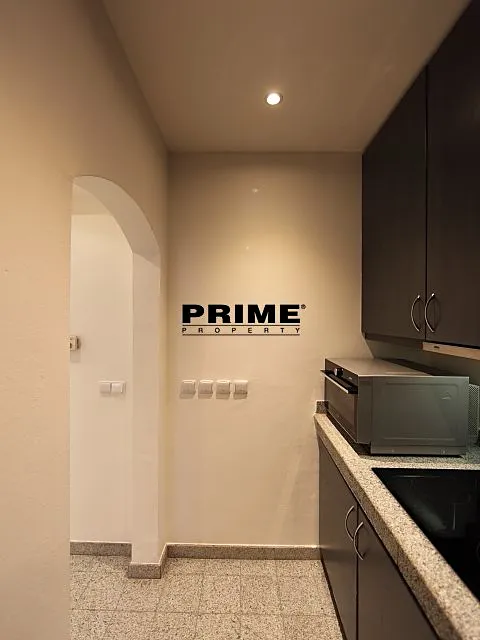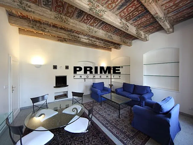 Z bytu je výhled na Pražský hrad a Čertovku. Dispozice bytu: obývací pokoj s krbem a barokním dřevěným malovaným stropem a s jídelní částí, samostatná, plně vybavená malá kuchyň se spotřebiči (sklokeramická varná deska, trouba, myčka, lednice a mrazák), ložnice s vlastní koupelnou (s hlubokou vanou/bazénkem, umyvadlem, toaletou a bidetem), druhá ložnice a druhá koupelna (se sprchovým koutem, umyvadlem, toaletou a bidetem).