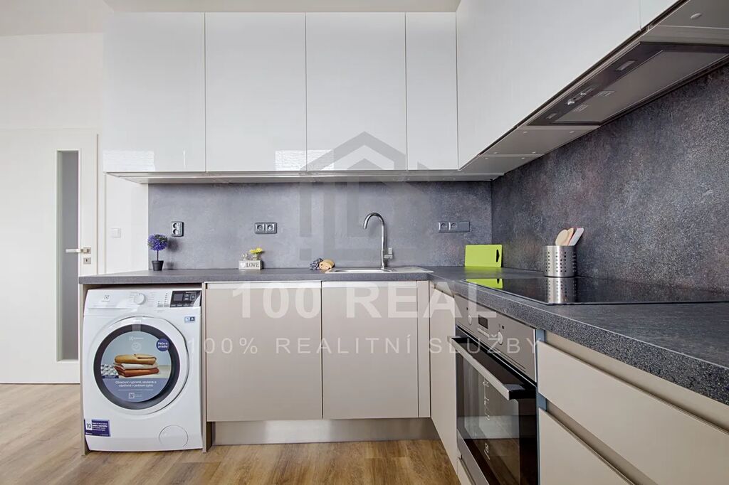 - kuchyň s moderní kuchyňskou linkou (Oresi) se zabudovanými spotřebiči (el. varná deska — indukce, el. trouba, mikrovlnná trouba, lednice s mrazákem, digestoř, myčka, pračka se sušičkou) a obývacím pokojem