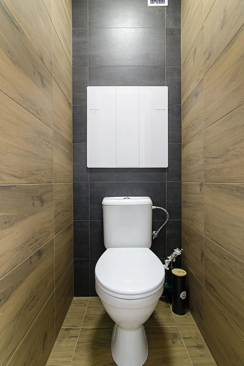 Koupelna je zvětšená, včetně obkladů a dlažby šedé barvy a dřeva, které k sobě ladí, designová skříňka s umyvadlem a zrcadlem s podsvícením. Rovněž je zde přípojka na pračku a sušičku.