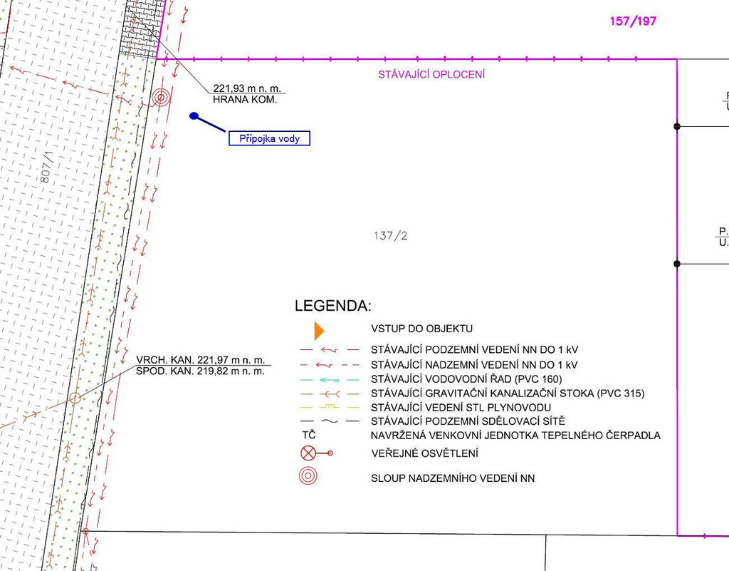Na pozemku je zřízena přípojka obecní vody. Elektřina, CETIN a kanalizace vedou přímo na hranici pozemku u přilehlé komunikace, viz situační výkres. Plyn vede na druhé straně silnice.