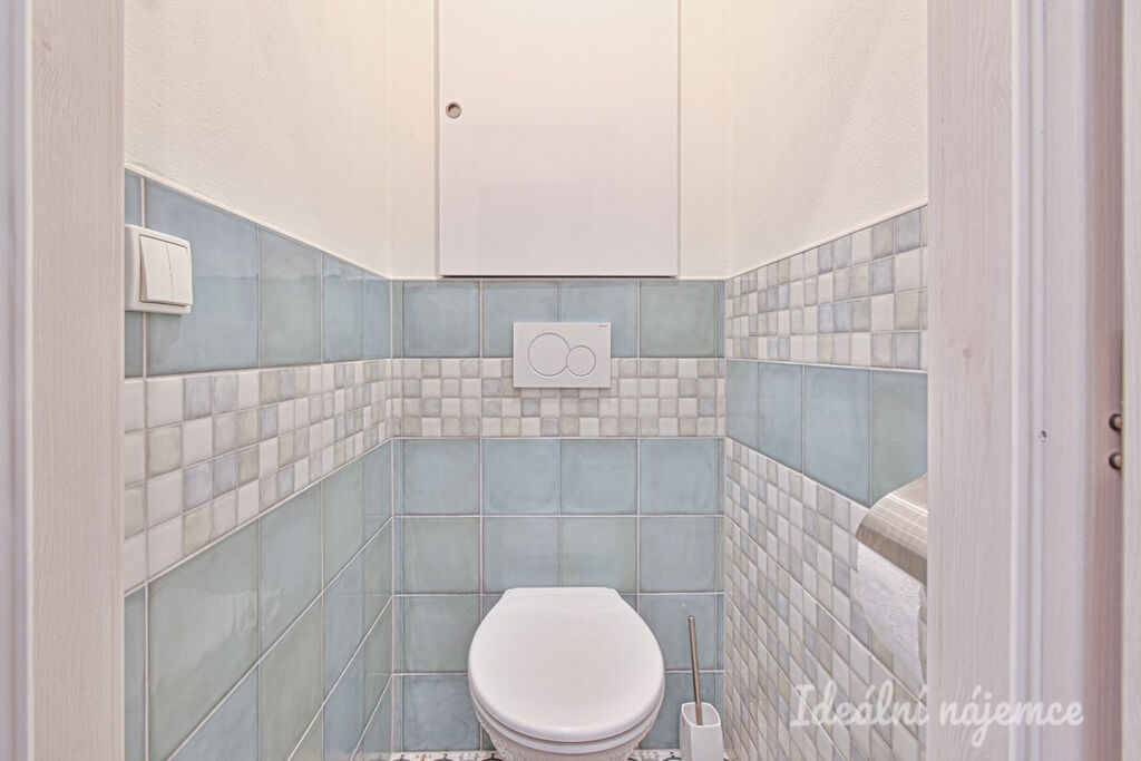 Koupelna disponuje vanou a umyvadlem se skříńkou. Toaleta je oddělena.
