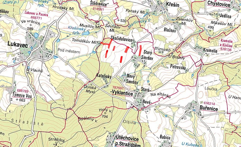 K prodeji je vlastnictví na pozemcích parc. č. 458/12, 460, 461, 535/8, 535/23, 539/4, 574, 576, 606, 640/3, 669, 670, 786, 788, 1140/51 a 1881/7 zapsaných na LV č. 474, KÚ Vyklantice.