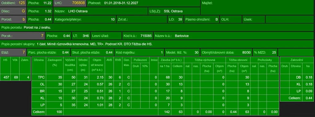 - p.č. 1481/5 vedená jako lesní pozemek o celkové výměře 4 400 m2 (stáří lesa 76 let - zastoupení dřevin topol, olše, bříza, javor, lípa), přístup k pozemku je přes louku.