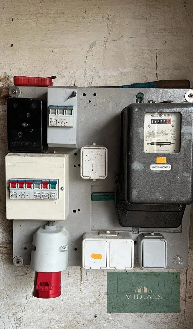 Vlastní elektřina 230 V , 380 V- vyúčtování ročně řešeno správcem, každá garáž v tomto bloku má podružný elektroměr.