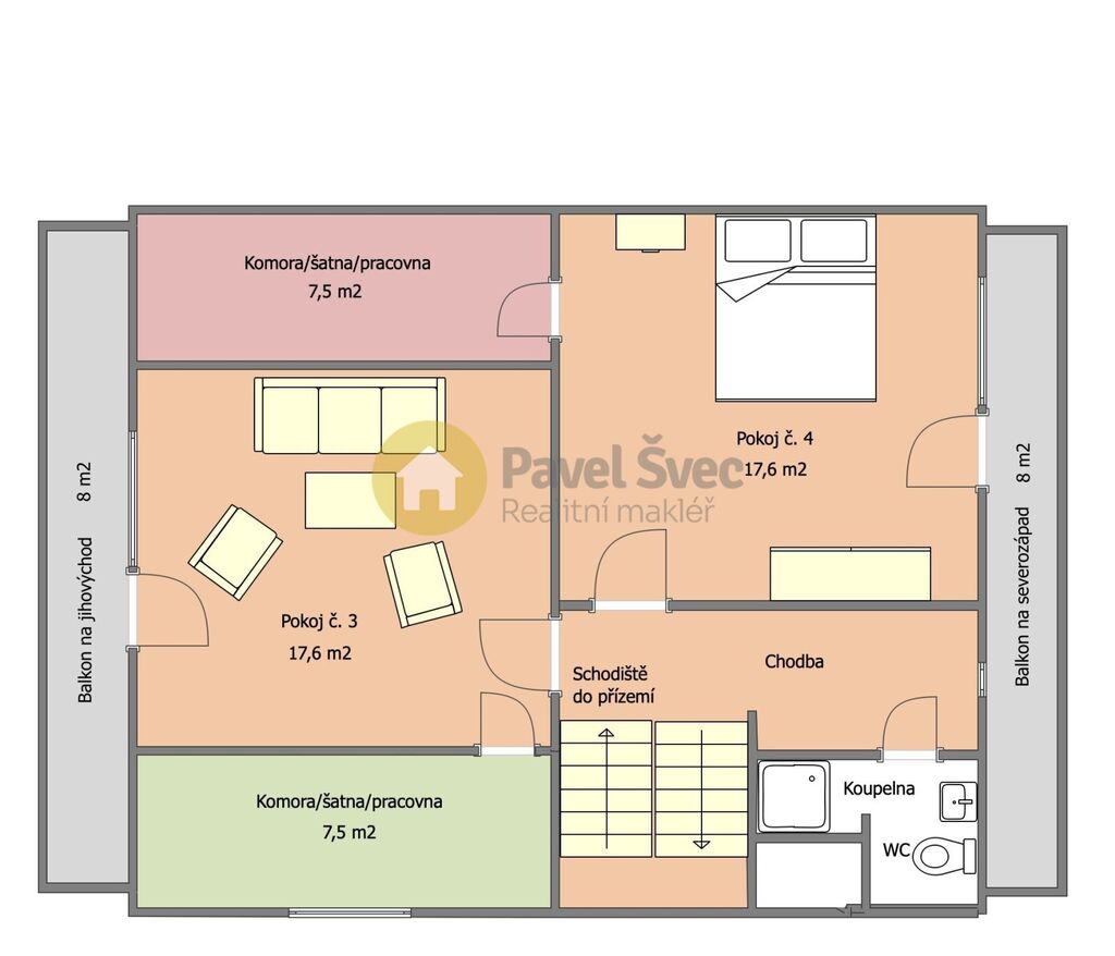V obytné části je v přízemí kuchyně a dva pokoje, v podkroví další dva pokoje a dva velké balkony orientované na jihovýchod a severozápad - nabízejí krásné výhledy na okolní přírodu.